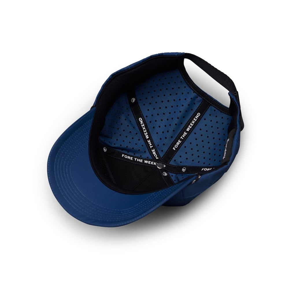 A navy blue golf hat with a flat brim and a small logo on the front.
