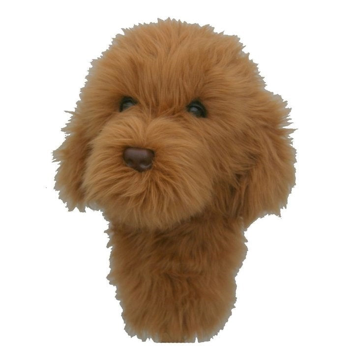A brown synthetic headcover designed to resemble a dog's face, specifically a poodle, with detailed eyes, nose, and fur.