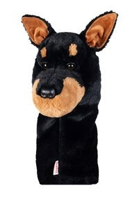 Golf club headcover designed to resemble a dog's head, primarily black with brown ears and a brown muzzle.