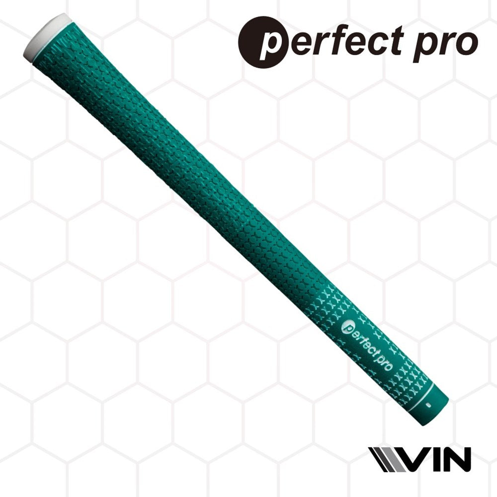 A green golf club grip with half cord texture and the branding 'perfect pro' visible endorsed by vin golf
