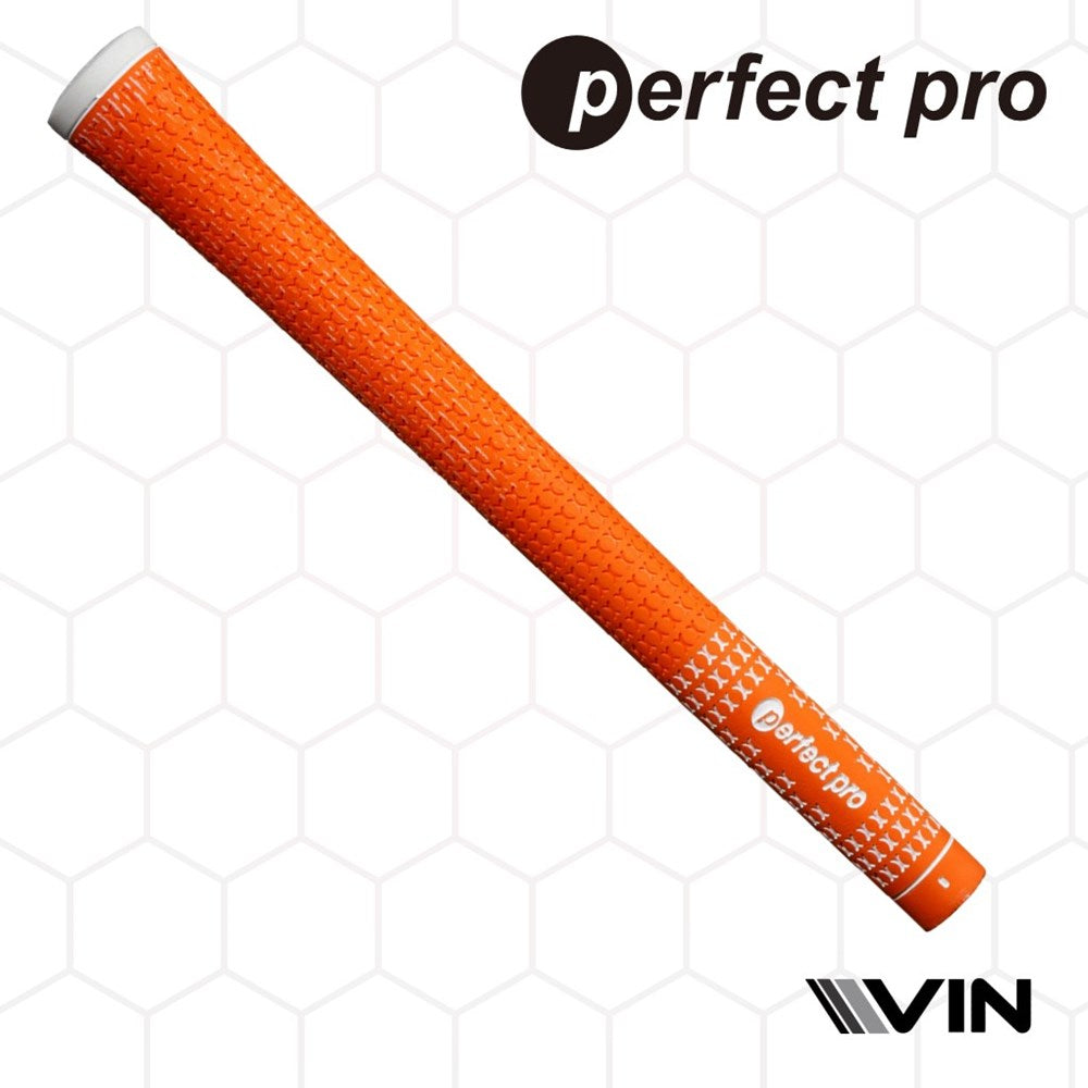 An orange golf club grip with half cord texture and the branding 'perfect pro' visible endorsed by vin golf