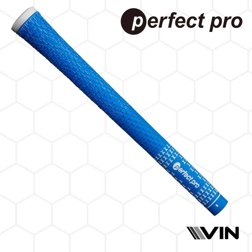 A blue golf club grip with half cord texture and the branding 'perfect pro' visible endorsed by vin golf