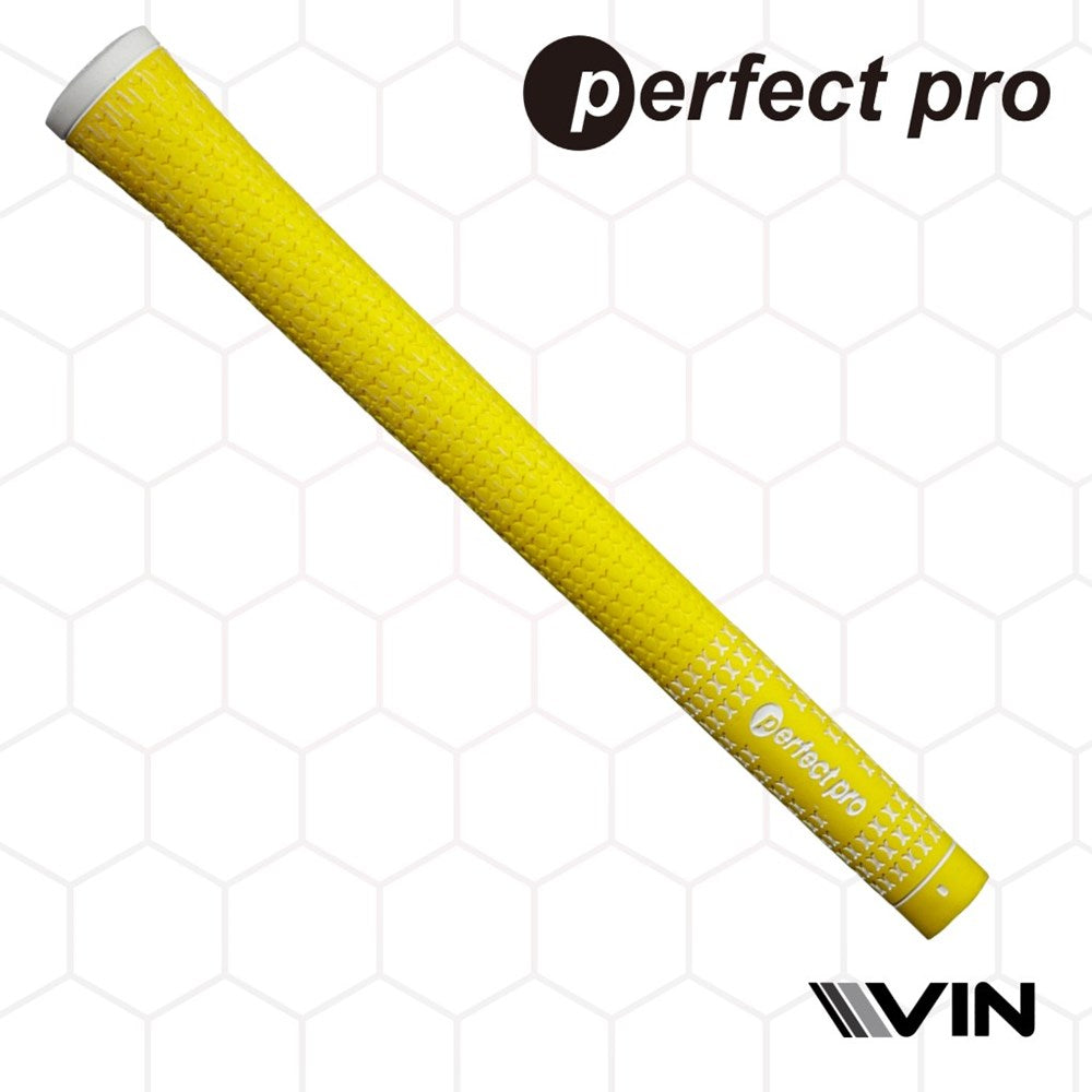 A yellow golf club grip with half cord texture and the branding 'perfect pro' visible endorsed by vin golf